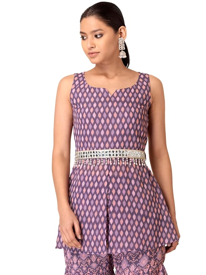 Vibrant and lively, elevate your festive look with this sangria short peplum kurta. Tailored in georgette, it features an ikat print and comes with an attached belt. Style Tip Pair it with sharara pants and stud earrings to elevate the look.