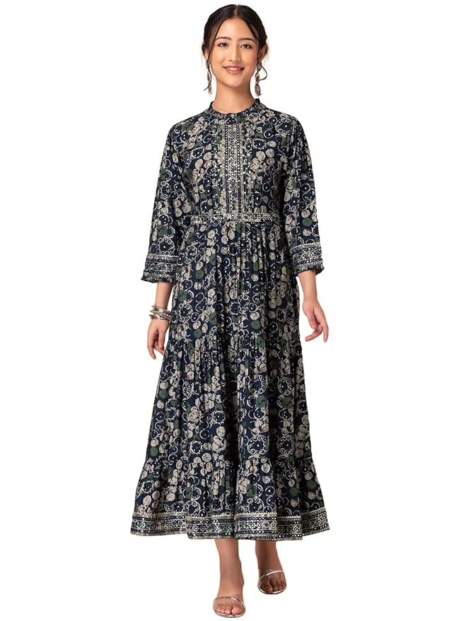 Indya Women’s Navy Blue Floral Print Tiered Dress with Belt (Set of 2)